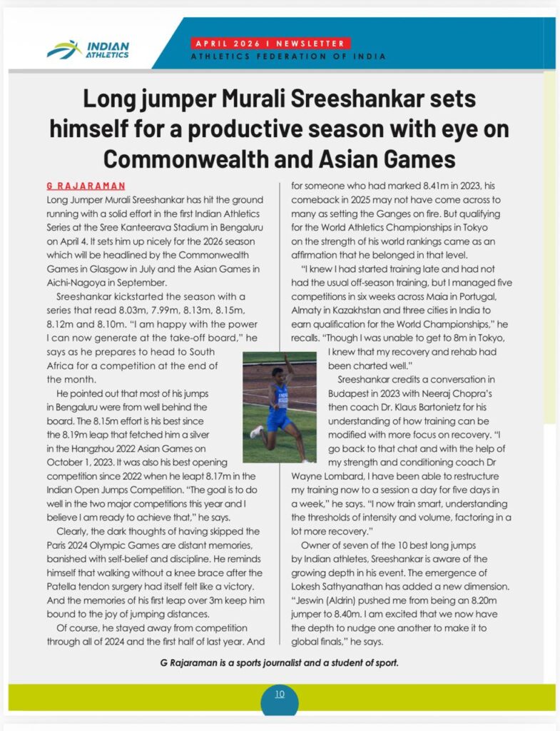 The 8.15m effort is his best since the 8.19m leap that fetched him a silver in the Hangzhou 2022 Asian Games on October 1, 2023. It was also his best opening competition since 2022 when he leapt 8.17m in the Indian Open Jumps Competition. “The goal is to do well in the two major competitions this year and I believe I am ready to achieve that,” he says.